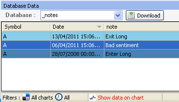 Notes plug-in is a tool that lets you add notes for your favorite stocks. Each note is associated with a security and a date. This means that it allows you to create several notes for a single security. Create a Note Open the Notes tool by right clicking on a chart, selecting "Tools" then "Notes". Alternatively, you can select a specific bar in a chart then type CONTROL+N. The advantage of the second method is that the Notes tool will be automatically associated with the bar's date. To add a new note, select a date at the top, type your note then click on "Add Note". At the bottom, a list allows you to select previously saved notes for the selected stock. Next to it, the tool displays the symbol name that is linked to the current notes as well as the total number of notes for that symbol. ![]() When the "Auto" option is checked, the Notes tool active symbol becomes linked to the active chart. When the selected chart symbol changes or when you select another chart, the active symbol of the Notes tool is automatically changed. Display Notes Notes are stored in a custom intraday database called "_notes." Select "Tools" in the menu, then "Database Data". Next to the "Database" field, select "_notes". Depending on the Viewer settings, the notes/dates of the active chart(s) are displayed in the grid. ![]() Click on "Show data on chart" to display these notes on the active chart. ![]() You can use the "Search" input field to search for a specific note. You can also display notes for several symbols by selecting the icon near "Filters". Advanced Use of the Notes tool Because notes are stored in a custom database, you can access them using functions such as "GetData". This allows you to create composites, screens, watch-lists... based on these notes. Example: a = GetDataCount("_notes", "note"); -> Displays the number of notes per trading day.