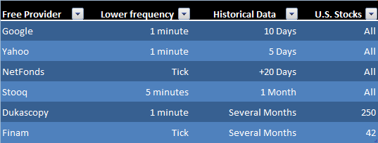 Few months ago, I have made a post about where to find historical end-of-day data for the US market and I have listed 10 websites that provide such data free (10 ways to download historical stock quotes data for free). Intraday and even tick data is also available free on the net. Today, I will show you six places where you can download and export historical intraday data. Some of these websites are very popular and some others you probably never heard about. Let us start with the most known ones. Google Finance In Google Finance, intra-day data is available free for several stock markets. The complete list can be found here. Data is available in several frequencies with the lowest one being one-minute time frame. The URL format is: https://www.google.com/finance/getprices?i=[PERIOD]&p=[DAYS]d&f=d,o,h,l,c,v&df=cpct&q=[TICKER] Example: https://www.google.com/finance/getprices?i=60&p=10d&f=d,o,h,l,c,v&df=cpct&q=IBM [PERIOD]: Interval or frequency in seconds [DAYS]: The historical data period, where "10d" means that we need historical stock prices data for the past 10 days. [TICKER]: This is the ticker symbol of the stock Symbol Lookup: https://www.google.com/finance More information: Intraday Data for US Stocks Yahoo Finance As with Google Finance, Yahoo allows you to download intraday data for several stock markets. You can get data for 62 exchanges. Format : https://chartapi.finance.yahoo.com/instrument/1.0/[TICKER]/chartdata;type=quote;range=1d/csv Example: https://chartapi.finance.yahoo.com/instrument/1.0/GOOG/chartdata;type=quote;range=1d/csv [TICKER]: This is the ticker symbol of the security Symbol Lookup: https://finance.yahoo.com/q?s=&ql=1 More information: More information: Intraday Quotes for Major Stock Exchanges NetFonds NetFonds is a Norwegian website. It is THE website you should use if you need tick and bid/ask history data for stocks listed on U.S. stock exchanges. To get tick data: https://hopey.netfonds.no/tradedump.php?date=20120423&paper=AAPL.O&csv_format=txt To get bid/ask price and volume data: https://hopey.netfonds.no/posdump.php?date=20120423&paper=AAPL.O&csv_format=txt Type the ticker symbol next to "paper=" parameter followed by the exchange code: NASDAQ: O NYSE: N AMEX: A The data format ("date" parameter) is YYYYMMDD The good news is that you can get historical tick data for more than 20 days. The bad news is that ... sorry there is no bad news; there is however another great news: The above link allows you to retrieve real-time tick data too (From BATS exchange). Stooq Two periods are proposed here: 5-Minutes and Hourly. The big advantage however is that all the data is available in one compressed file. https://stooq.com/db/h/ You can also choose to download intra-day data for some specific dates: https://stooq.com/db/ If you do not need low period data then this website will probably become your best source of intra-day data. Dukascopy Dukascopy, the Swiss Forex Bank has a nice CSV DATA Export tool. You will not get data for the entire U.S. stock market but you will be able to export CSV data of several ones and for different periods (1 minute, 10 minutes, and 1 hour). Dukascopy has also intra-day data for several currency pairs and indices (Japan Topix index, Canadian TSX Indiex, VIX, Russell 2000, Russian RTS Index, CAC 40, Futsee 100...) https://www.dukascopy.com/swiss/english/data_feed/csv_data_export/ Finam Finam is a Russian website that provides data for the stock, futures, ETF and Forex markets. The main advantage here is that you can download several months worth of tick data. The problem however is that the data is available for 42 stocks only (Highly capitalized stocks). Here is how to download stock data: - Use Google translate to translate this website - Go to https://www.finam.ru/analysis/profile041CA00007/default.asp - In the top form, select "U.S. Stocks (BATS)" - Next to it, select a stock (Example: Exxon Mobil) - Select the interval and frequency (Example: 20.04.2012 -> 24.04.2012 and tick data) - Click on "Get the file" to download stock data in CSV format Finally, here is a table that summarizes the different intraday data providers: ![]() To get Forex data, visit the following link: 6 places to download historical intraday Forex quotes data for free